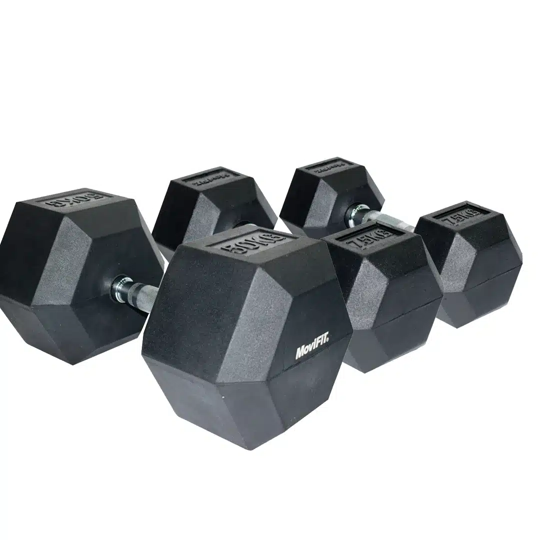 Mancuerna Hexagonal Encauchetada Movifit. Resistente y segura, con recubrimiento de caucho y forma estable para entrenamientos de fuerza y tonificación.