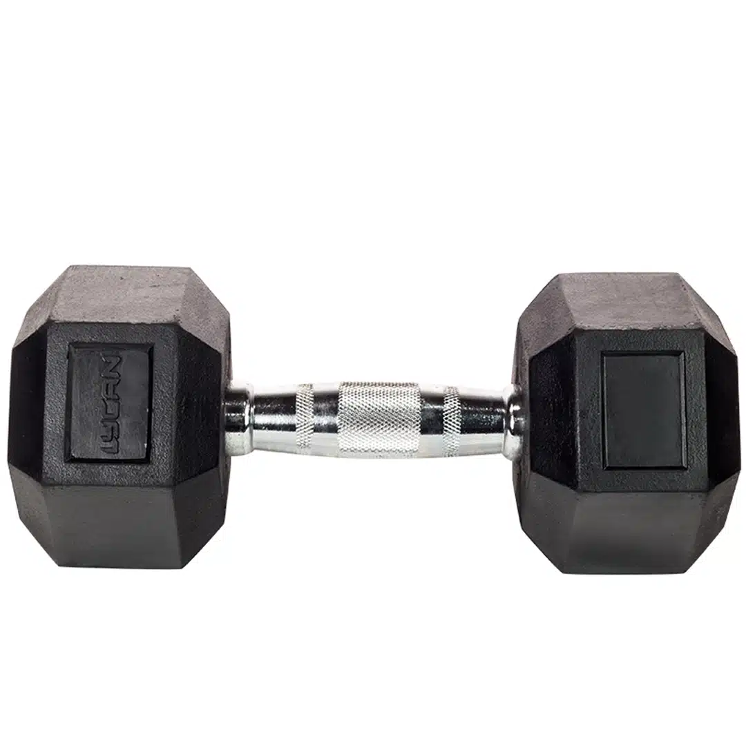 Mancuerna Hexagonal Hex Dumbbell 40 lb Lycan. Con goma protectora y agarre cromado, brinda estabilidad, seguridad y comodidad en cada rutina.
